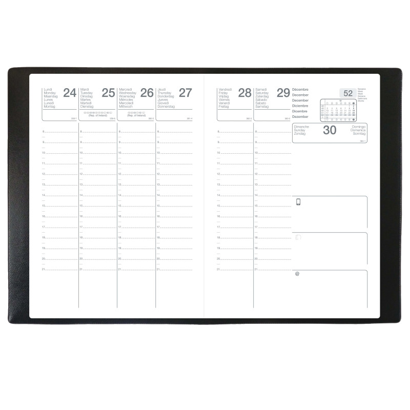 Semainier de bureau de septembre à septembre. Toute la semaine planifiée sur 2 pages avec notes. Papier blanc, impression noir, multilingue. Couverture noire en plastique lisse.
