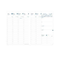 Agenda Planing, la semaine d’un seul coup d’oeil . Rendez-vous par quart d’heure. Répertoire amovible couverture en toile enduite façon grain caviar et piqûre sellier. 13 mois d’août à août.