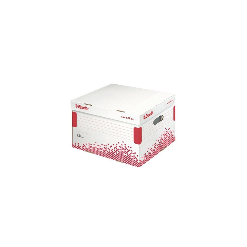 En carton. Ouverture sur le dessus. Fond automatique pour un montage rapide. Bords et dessous du container à double épaisseur pour faciliter l'empilage et garantir plus de résistance. Capacité : 5 boîtes avec dos de 80 mm ou 4 boîtes avec dos de 100 mm. Dimensions : 433 x 263 x 364 mm. Produit certifié fsc.