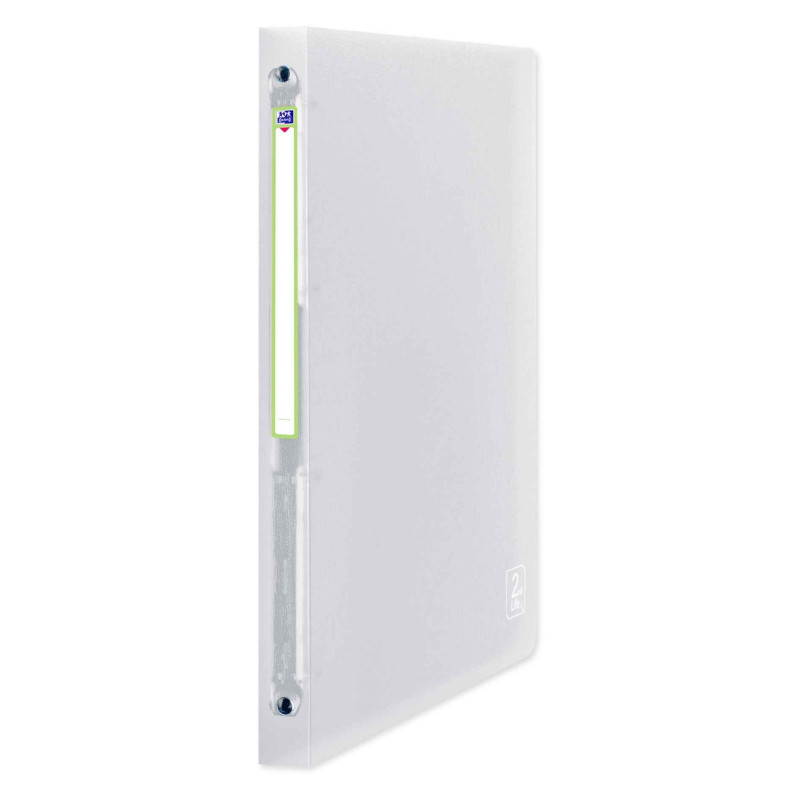 Classeur cahier, dimensions extérieures : 32 x 25 cm. Dos 20 mm. 4 anneaux ronds Ø 15 mm, couverture en polypro translucide 100% recyclée 5/10e. Étiquette d’dentification adhésive.
