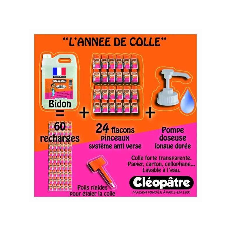 Sans solvant, à base d’eau - Usage : papier et carton - Temps de prise : rapide - Force de collage : moyen.1 an de collage pour la classe : 24 flacons de 80 g de colle avec pinceaux, 5 kg de colle transparente (soit l’équivalent de 60 recharges de 80 g) et une pompe.Le classpack