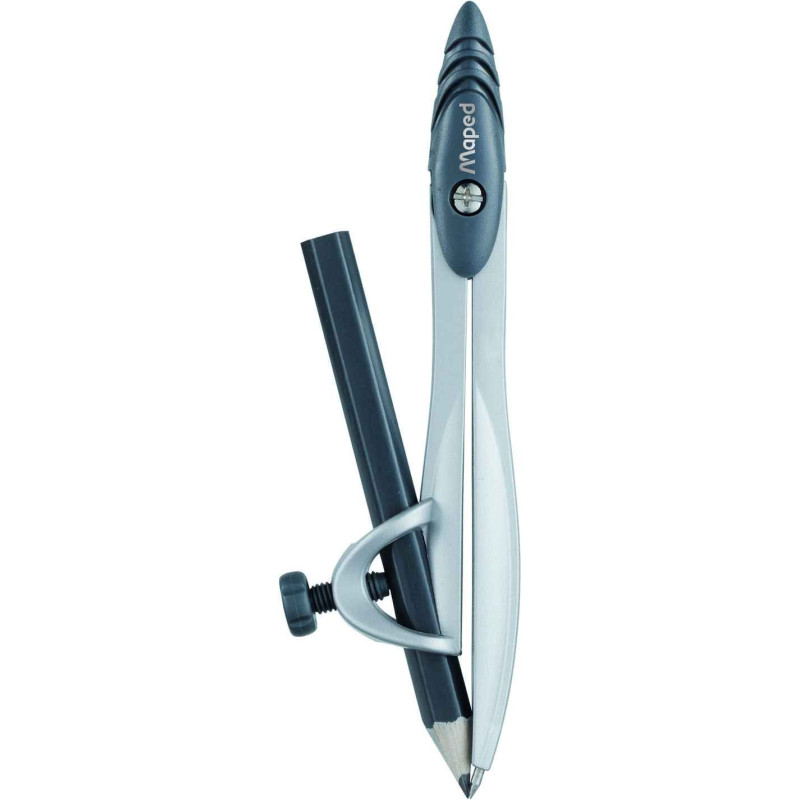 Compas à bague universelle, branches courtes en métal. Longueur totale du compas 12 cm. Livré avec crayon.Le compas