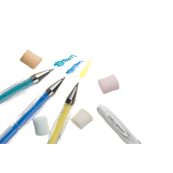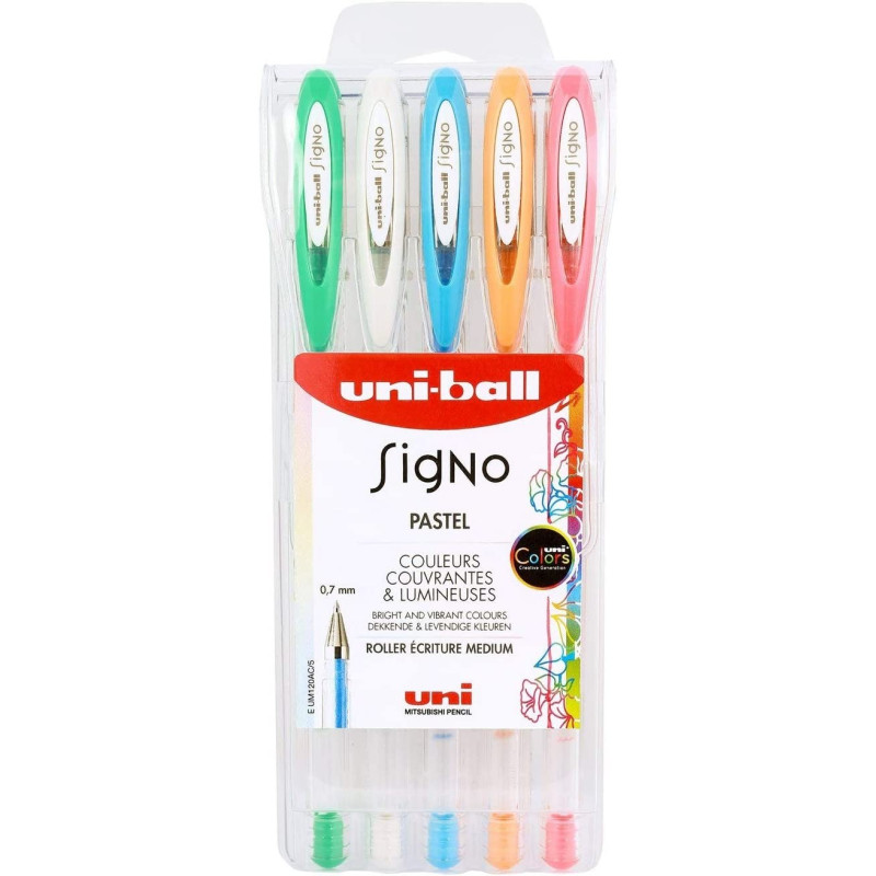 Uni ball UM 120 AC Séchage éclair. Stylo encre gel à pigmentation longue durée écriture douce et fluide. Nouveau système de pointe permettant une écriture penchée jusqu'à 50 % d'écriture en plus. Pointe large 1mm, Permet l'écriture sur papiers couchés, couleurs, blancs, noirs, photos, tissus, 5 couleurs : Rouge bleu orange vert blanc