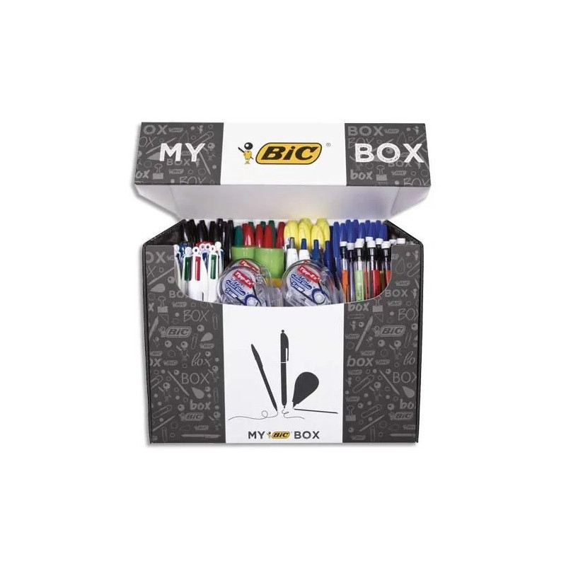 54 stylos-Bille Cristal, 14 stylos-bille 4 Couleurs, 24 porte-mines Bic Matic Original, 8 correcteurs Mini Pocket Mouse, 3 Marqueurs Permanent 2000, 1 Marqueur Permanent 1445, 3 Marqueurs Velleda 1701, 8 Surligneurs Briteliner Grip Jaunes