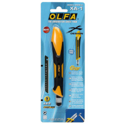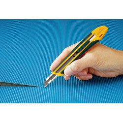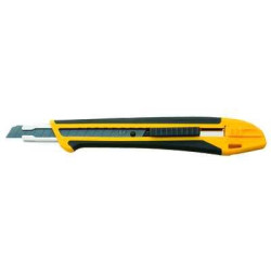 Guide-lame en acier, manche polypro jaune et élastomère noir anti-glisse (anti-acétate, anti-acide), lame noire très affûtée. Verrouillage automatique, fixation de poche, clip embout casse-lame. À utiliser avec lames 9 mm Olfa.