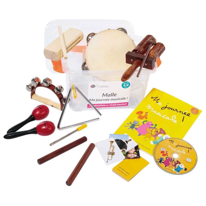 Une malle de 16 instruments idéale pour un petit groupe. Elle permet de découvrir des techniques de jeux propres aux percussions. Utilisation : Primaire et Collège. Diversité d’instruments et faible encombrement ! Contenu : 2 poignées de grelots, 1 paire de claves Acacia L. 18 cm, 1 paire de claves Pao rose 14 cm, 1 tube résonant Pao rose 2 tons, 1 tambourin peau naturelle avec cymbalettes Ø 15 cm, 1 octo-block, 1 crécelle, 1 paire d’oeufs sonores maracas, 1 triangle 13 cm, 2 bracelets de 5