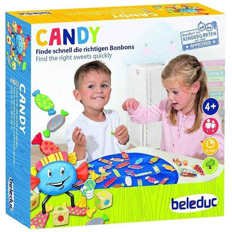 But du jeu : les bonbons sont déposés sur le tapis de jeu. Un joueur jette les 3 dés de couleur. Il faut être le premier à trouver le bonbon qui a les 3 couleurs désignées par les dés. Intérêt pédagogique : observation et réflexe.Contenu : 1 tapis de jeu tout doux (Ø 45 cm), 41 bonbons en bois, 3 dés de couleur et la règle du jeu2 à 8 joueurs - Durée : 10 min