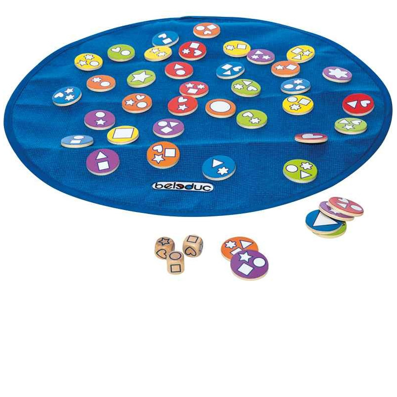 But du jeu : les pièces avec des formes sont déposées sur le tapis de jeu. Un joueur jette les 3 dés forme. Il faut alors être le premier à trouver la pièce qui représente les 3 formes désignées par les dés. Intérêt pédagogique : concentration, discrimination visuelle et rapidité.