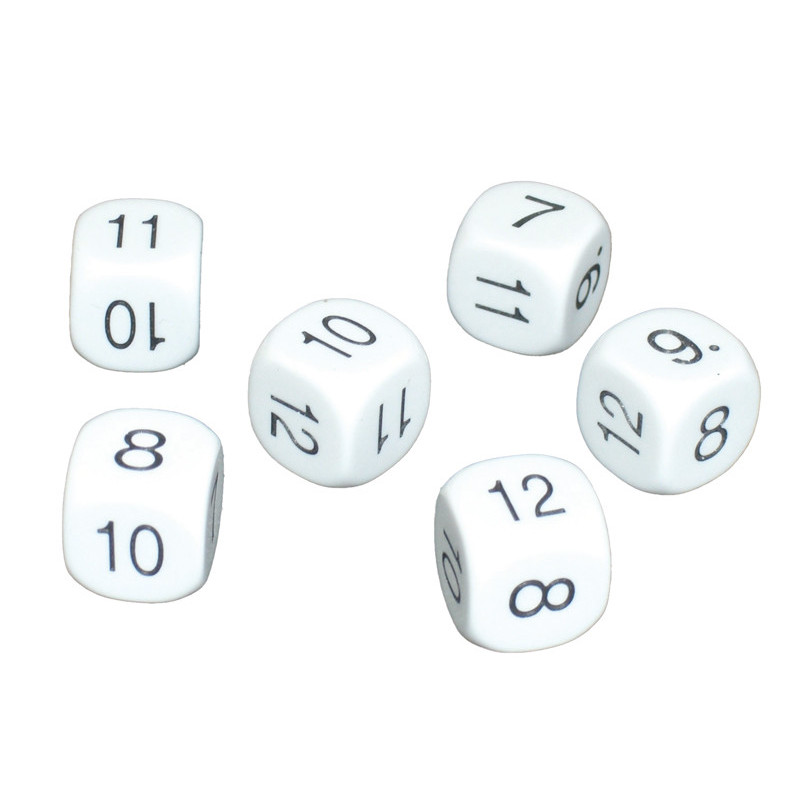 Pour un groupe de 20 élèves.Contenu : 20 dés signes, 101 dés de chiffres, 30 dés de points, 10 dés blancs - L’ensemble de 161 dés