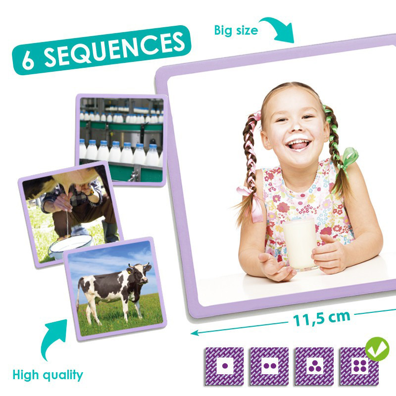 Séquences très simples avec des photographies de grandes dimensions, qui permettent aux plus petits de s’initier dans la perception temporelle. Utilisable pour maintenir et stimuler les capacités cognitives des séniors.Contenu : 20 images sur cartons solide et rigide (4 aux contours bleus, 4 rouges, 4 jaunes, 4 violets et 4 verts)