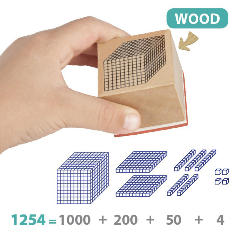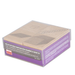 Tampons de décomposition numérique en base 10 pour représenter des quantités. Convient pour tout type d’encre.Contenu : 4 tampons bois représentant l'unité, les dizaines, les centaines et les milliers