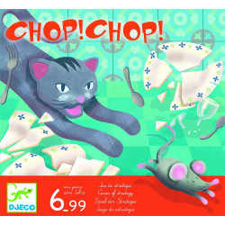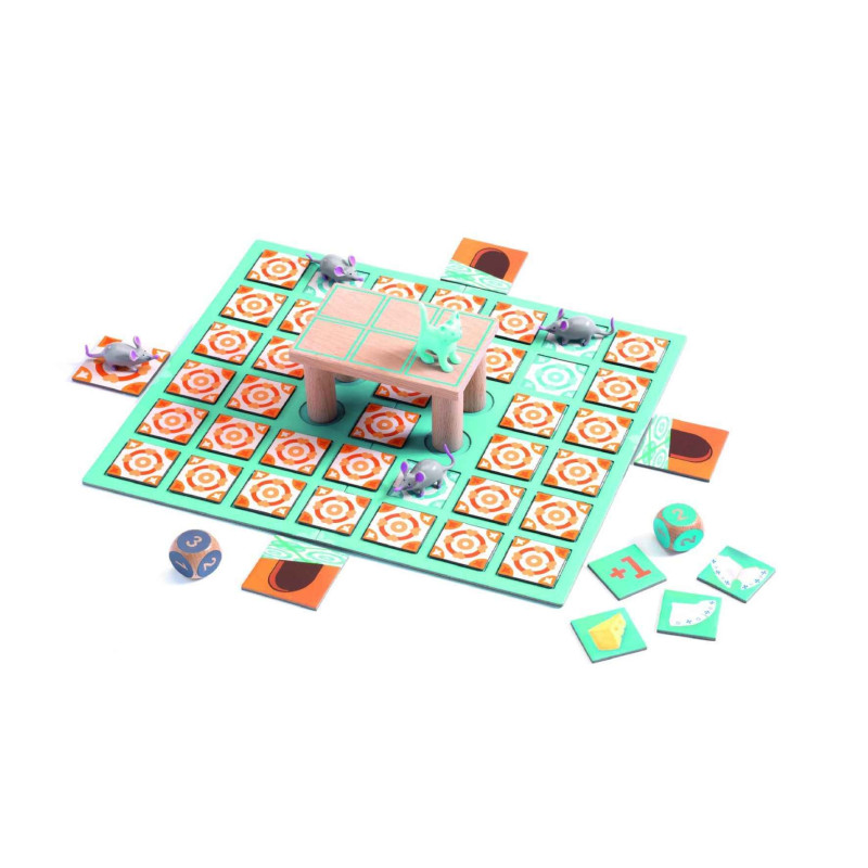 Contenu : 1 figurine chat, 4 figurines souris, 2 dés (souris et chat), 38 tuiles, 4 tuiles trou de souris, 1 table en bois à monter, 1 plateau de jeu et 1 règle du jeu