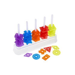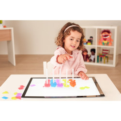 Les pièces qui peuvent être utilisées pour s'empiler et s'emboîter pour construire des pyramides multicolores. Matériau translucide de haute qualité, adapté pour les tables lumineuses. Activité sensorielle et manipulative qui favorise la stimulation et la concentration. Activité créative et de concentration permettant des créations libres ou des jetons d'activité avec des modèles à imiter.Contenu : 25 pièces et 4 fiches d'activités A3 transparentes