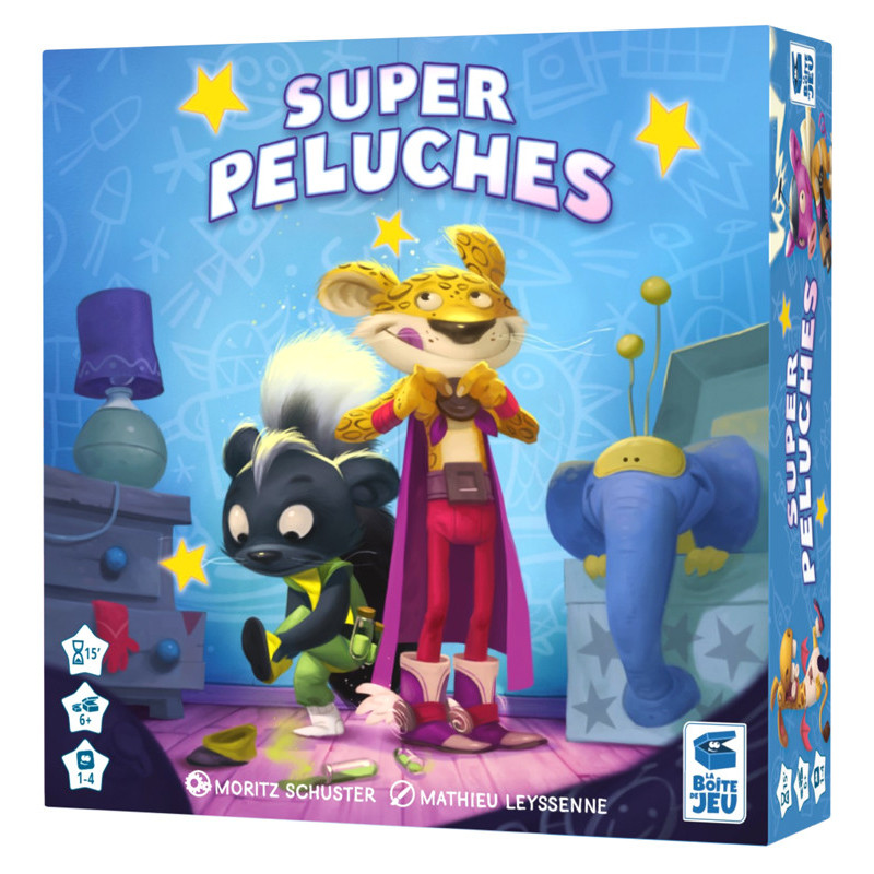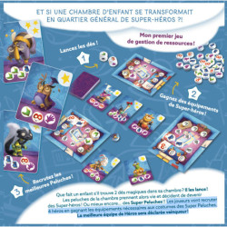 But du jeu : lancez les dés pour collecter différentes parties des costumes de super héros de vos peluches. Masques, Bottes, Capes ... Les joueurs vont recruter 4 héros en gagnant les équipements nécessaires aux costumes des Super Peluches. La meilleure équipe de Héros sera déclarée vainqueur !Contenu : 48 jetons équipement (12 gants, 12 bottes, 12 capes, 12 Masques), 1 jeton Premier Joueur, 24 cartes Super Peluches, 8 cartes Bonus, 2 dès et 4 plateaux Chambre1 à 4 joueurs - Durée : 15 min
