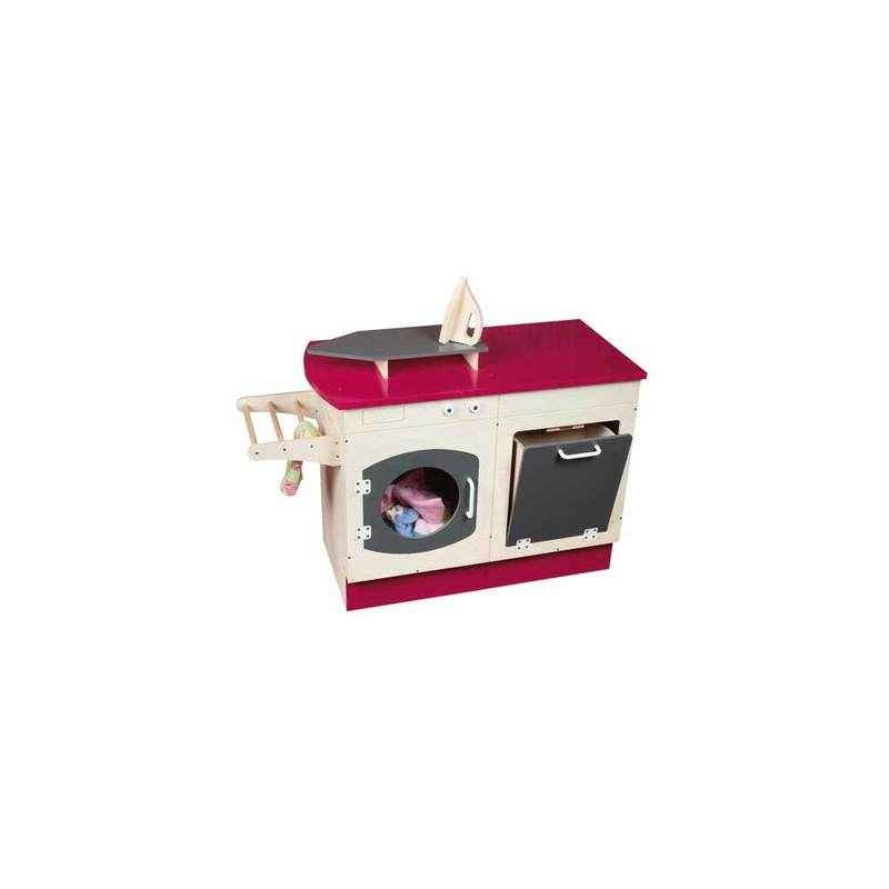 Le meuble comprend une table à repasser et son fer, un lave-linge avec hublot, un tiroir de rangement et un séchoir. Structure en multiplis bouleau naturel et laqué gris/bordeaux. Livré non monté. Jouet fabriqué en France. Bois issu de forêts durablement gérées et certi?é PEFC.