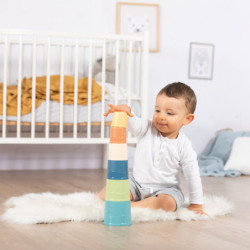 Tour de 6 gobelets à empiler (hauteur : 40 cm). Développement de la motricité et de la reconnaissance des formes. Plastique biosourcé.Contenu : 6 gobelets coloris assortis