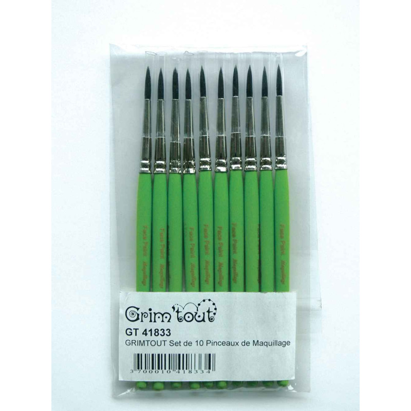 Ce set de 10 pinceaux ?ns de 15 cm de long de maquillage Grim’tout est idéal pour tracer des traits ?ns sur le visage et le corp. Ces pinceaux sont de qualité cosmétique professionnelle et sont faits de poils synthétiques. Conseils d’utilisation : Toujours nettoyer les pinceaux immédiatement après usage et ne jamais les laisser reposer sur leur pointe.