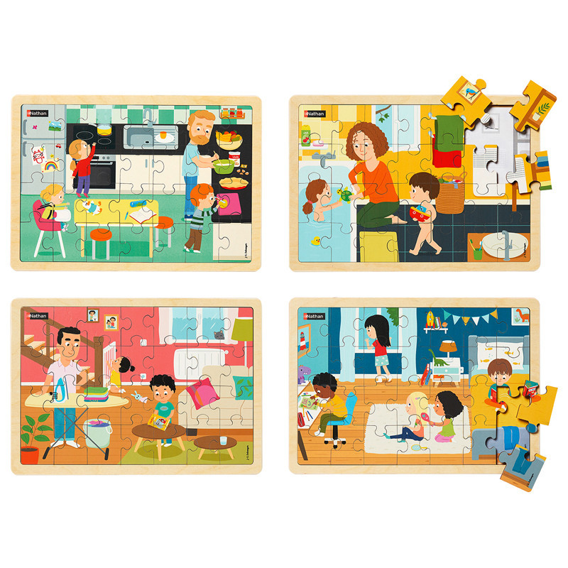 À reconstituer avec ou sans le modèle. Des illustrations riches et colorées imprimées sur le bois. Modèle amovible recto verso : couleurs ou noir et blanc. Avec cadre.Le lot de 4 puzzles de 28 pièces : dans la cuisine, dans la chambre, dans la salle de bains et dans le salon