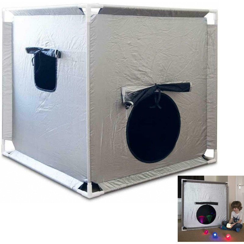 Tente pop-up, idéale pour une mini-salle sensorielle temporaire en classe. Idéal pour explorer des accessoires qui s'illuminent, brillent dans l'obscurité, parfait pour créer un environnement apaisant avec un éclairage d'ambiance.Dim. (L x l x H) : 100 x 100 x 100 cm