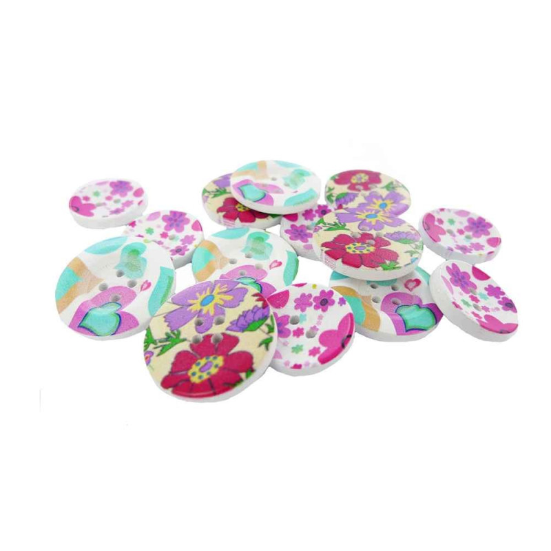 Boutons bois, 3 modèles assortis (Ø 1,8, 2 et 2,5 cm). Fleurs et cœurs.