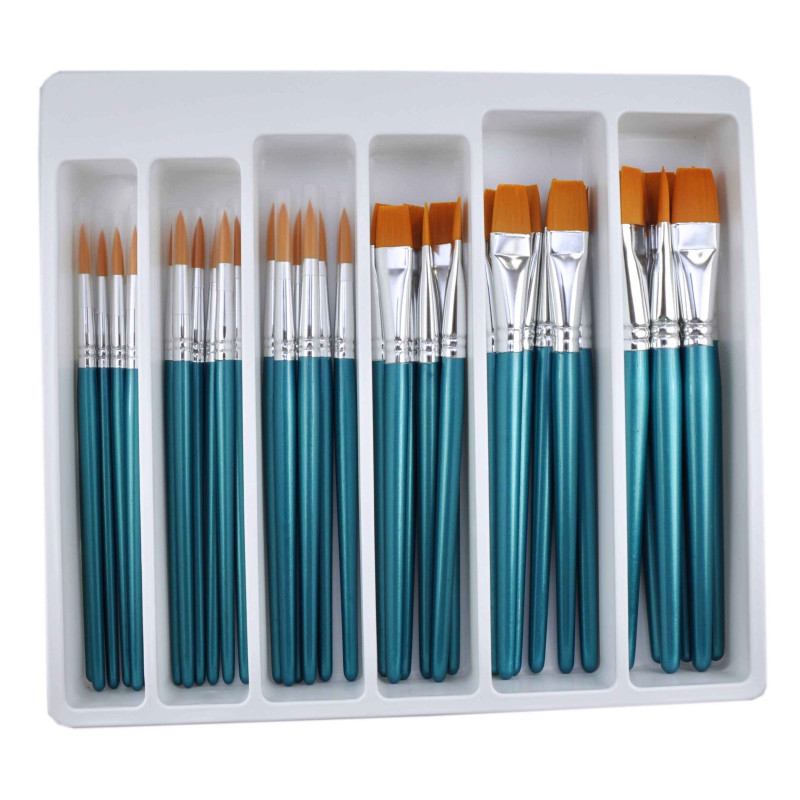 Fibres synthétiques de grande qualité pour un excellent niveau de précision. Pointe douce et ferme pour toutes les techniques sur tous les supports. Lot de 144 pièces assorties : 24 pinceaux ronds par taille : n°4, n°8, n°12 - 24 brosses plates par taille : n°4, n°8, n°12