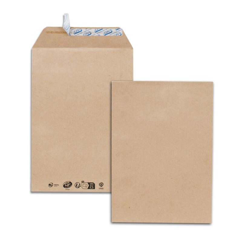 Pochettes kraft brun milleraies qualité supérieure. Fermeture adhésive avec bande de protection. Sans fenêtre. Produit certifié pefc.