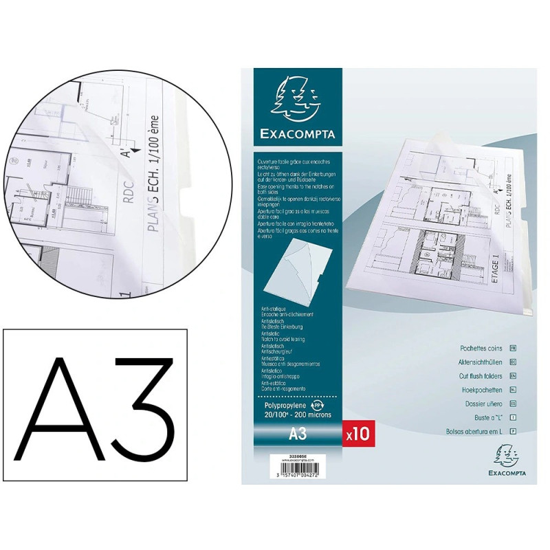 Pochettes coins A3 PP lisse et rigide. Epaisseur 20/100e. Sachet de 10 pochettes cristal.
