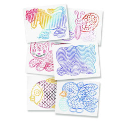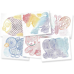 Placez une feuille de papier sur la plaque et frottez un crayon ou un pastel sur du papier. Révélez des textures géométriques en forme d’animaux (6 modèles assortis).