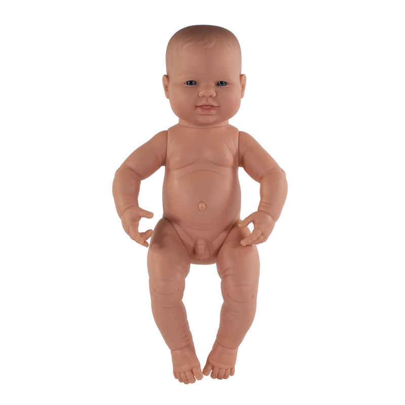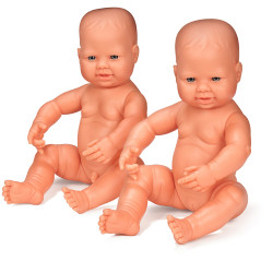 Réalisés en vinyle doux, ces bébés sont flexibles, résistants, légèrement parfumés et peuvent être baignés. Têtes, bras et jambes sont articulés.Garçon Européen - Dim. (H) : 32 cm - L'unité