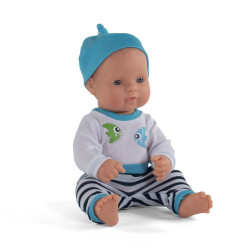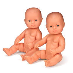 Réalisés en vinyle doux, ces bébés sont flexibles, résistants, légèrement parfumés et peuvent être baignés. Têtes, bras et jambes sont articulés.Fille Africaine - Dim. (H) : 38 cm - L'unité