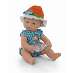Réalisés en vinyle doux, ces bébés sont flexibles, résistants, légèrement parfumés et peuvent être baignés. Têtes, bras et jambes sont articulés.Fille Européenne - Dim. (H) : 38 cm - L'unité