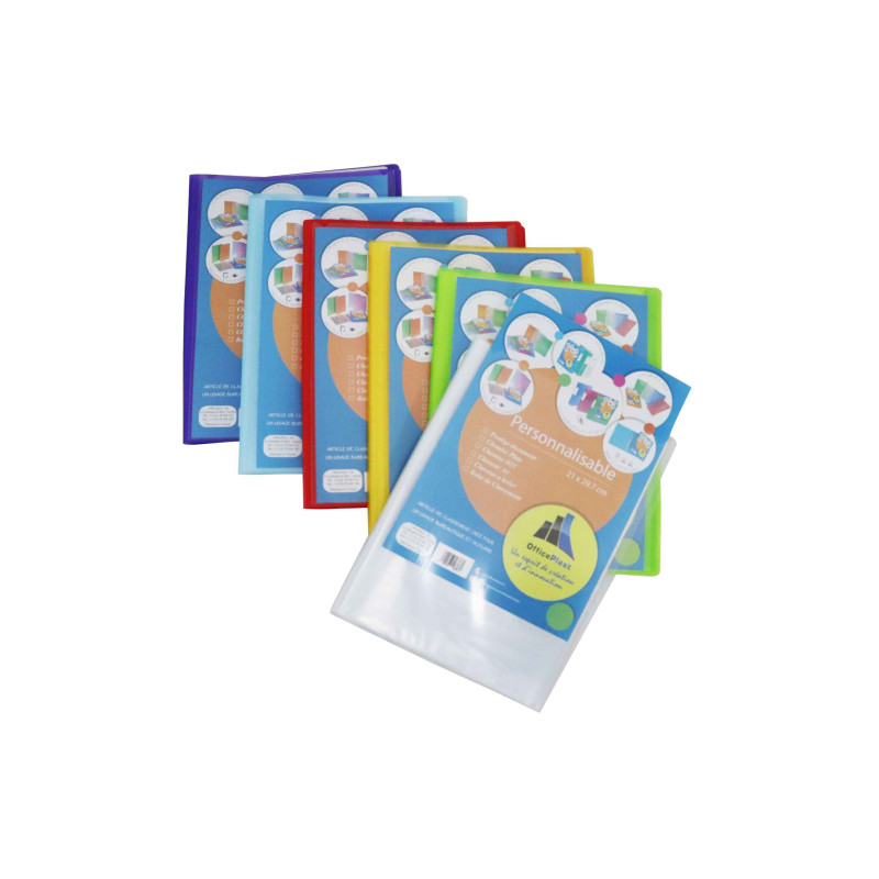 Couverture en polypropylène translucide 3/10e. Pochettes intérieures polypro 40 µ lisse. Dimensions 23,8 x 31 cm pour format A4. 6 Coloris assortis : rouge,bleu, vert, jaune, blanc, violet (livraison selon arrivage).