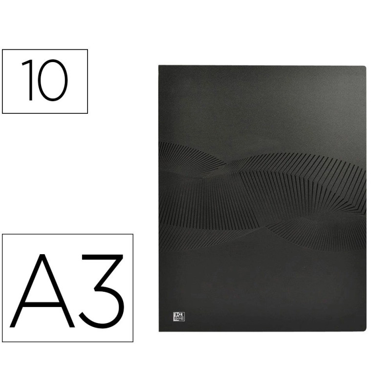 En polypropylène 7/10e avec grain à motif spirale. Pochettes intérieures en polypropylène 9/100e lisse. Insertion par le grand côté. Orientation paysage pour la consultation des documents en A3. Fermeture par élastique. 20 vues, 10 pochettes. Pour format A3.