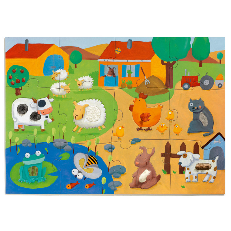 Grandes pièces adaptées aux mains des tout-petits. Pour découvrir par le toucher les textures des 8 pièces animaux de la ferme.Contenu : 20 pièces - Dim. du puzzle (L x l) : 70 x 50 cm