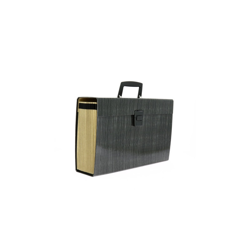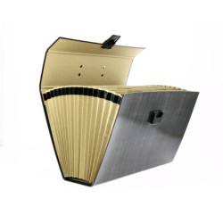 20 compartiments à soufflets pour format A4. Couverture papier rembordée. Fermeture par rabat et tuck. Avec poignée.