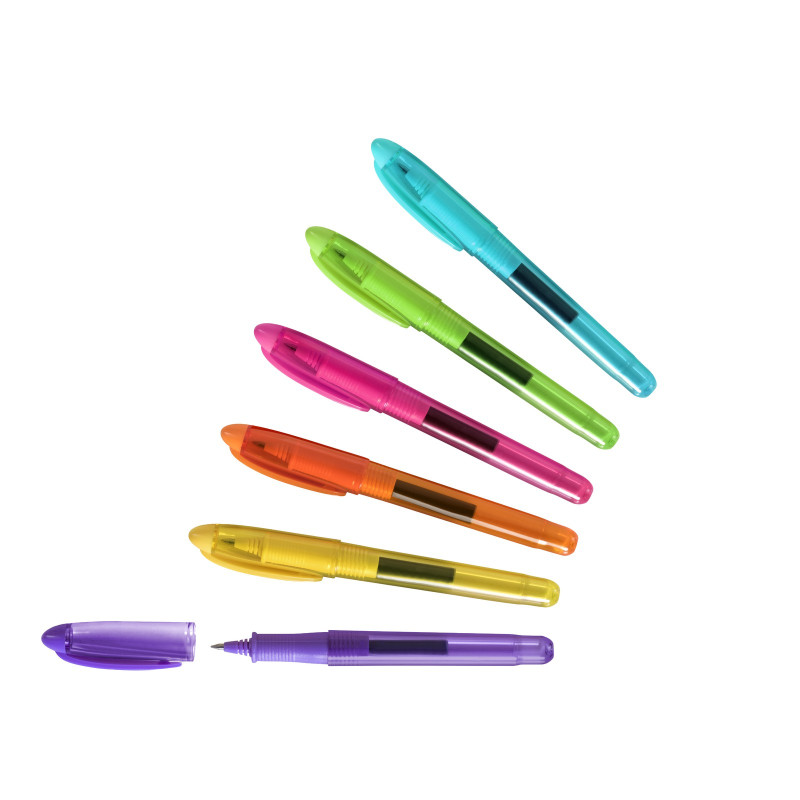 Stylo à plume ergonomique à grip caoutchouté et pointe en acier inoxydable, doté d’un capuchon réversible avec un clip de plastique et cartouches d’encre standard. Corps plastique bi-colore, couleurs assorties.Le stylo