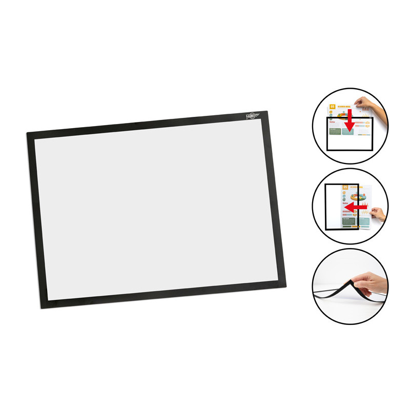 Permet d'afficher tout type de document sur un support métal comme une armoire, une porte, un panneau, un tableau blanc...Pour protéger et exposer des instructions, des notes d'information, des consignes de sécurité, des règlements, des plannings…. 4 faces verso de la pochette sont équipées d'aimants résistants, la 4ème face est accessible pour glisser si besoin les documents. Position portrait ou paysage possible.Format A4 - Coloris argent