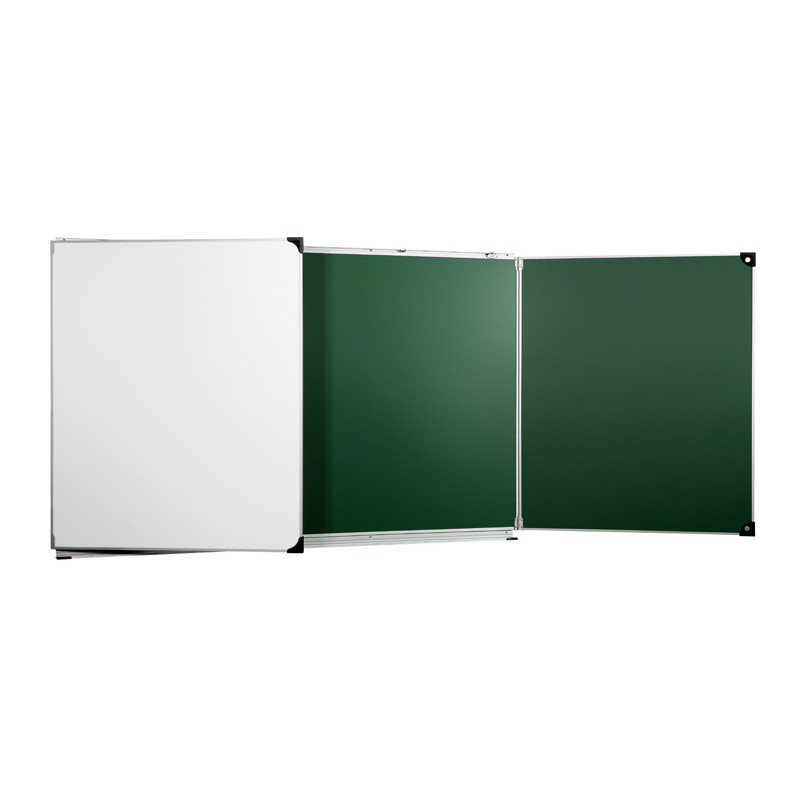 Surface d’écriture garantie à vie : tôle émaillée. Encadrement en aluminium anodisé. Rail supérieur muni de crochets porte-documents. Auget en aluminium anodisé sur toute la longueur du panneau central. Protection des extrémités de l’auget et des coins afin d’éviter les accidents avec les angles vifs. Système de blocage des volets en position ouverte et fermée pour une meilleure stabilité lors de l’écriture. H 100 x L 200 cm + 2 volets H 100 x L 100 cm - Vert