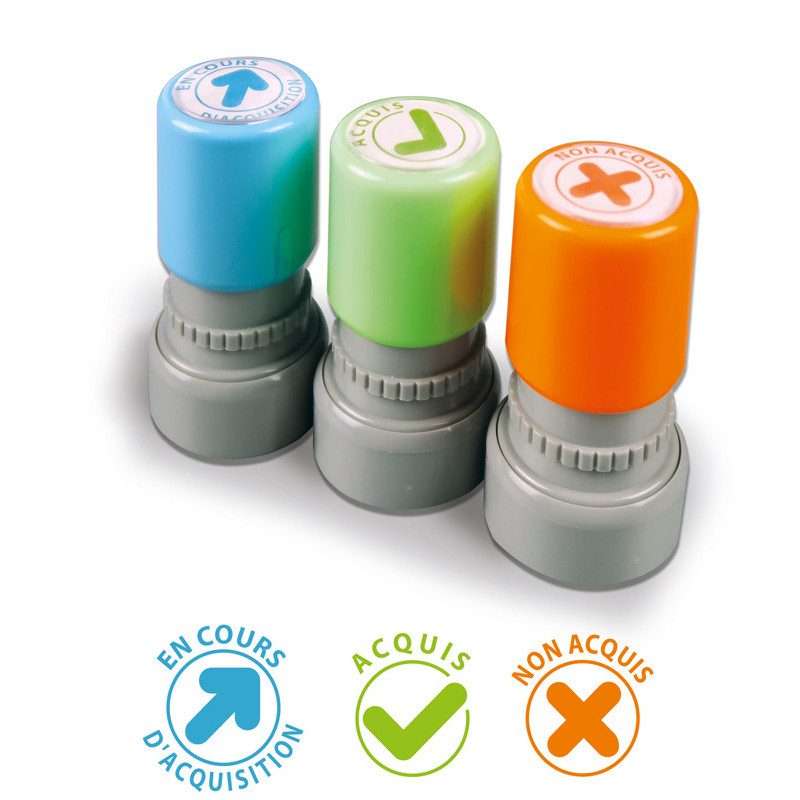 Tampons scolaires d'appréciations pour les enseignants afin d'agrémenter le travail des enfants avec des empreintes drôles et motivantes. - Simples et pratiques, prêts à l'emploi - Maniement facile : la poignée simple mais ergonomique garantit un emploi sans effort - Encre de couleur pour des empreintes brillantes et joyeuses - Ø de chaque empreinte : environ 20 mm