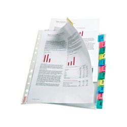 En polypropylène lisse transparent 8/100ème. Organisation et rangement faciles des documents avec les feuilles intercalaires, qui peuvent également s'utiliser comme des pochettes. Copysafe. Ouverture en haut. Perforation 11 trous. Pour format a4. Dimensions : 250 x 320 mm.
