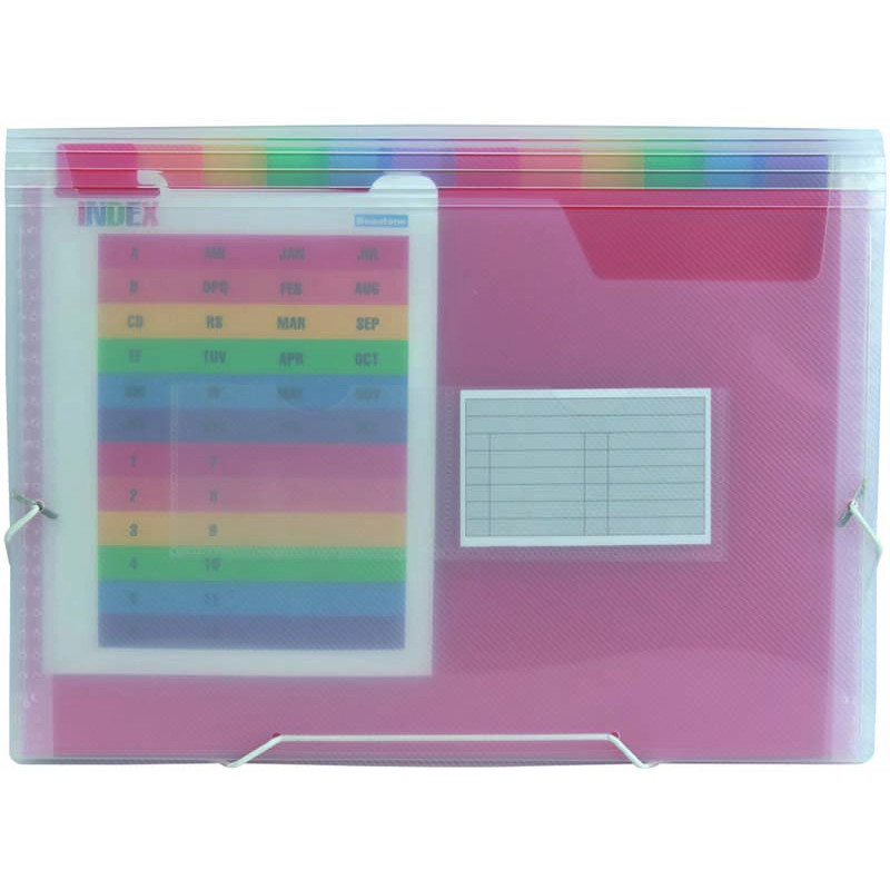En polypropylène 7/10ème. 13 compartiments de couleur. Fermeture à élastique. 2 porte-cartes de visite. Coloris transparents.La valisette