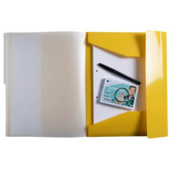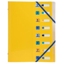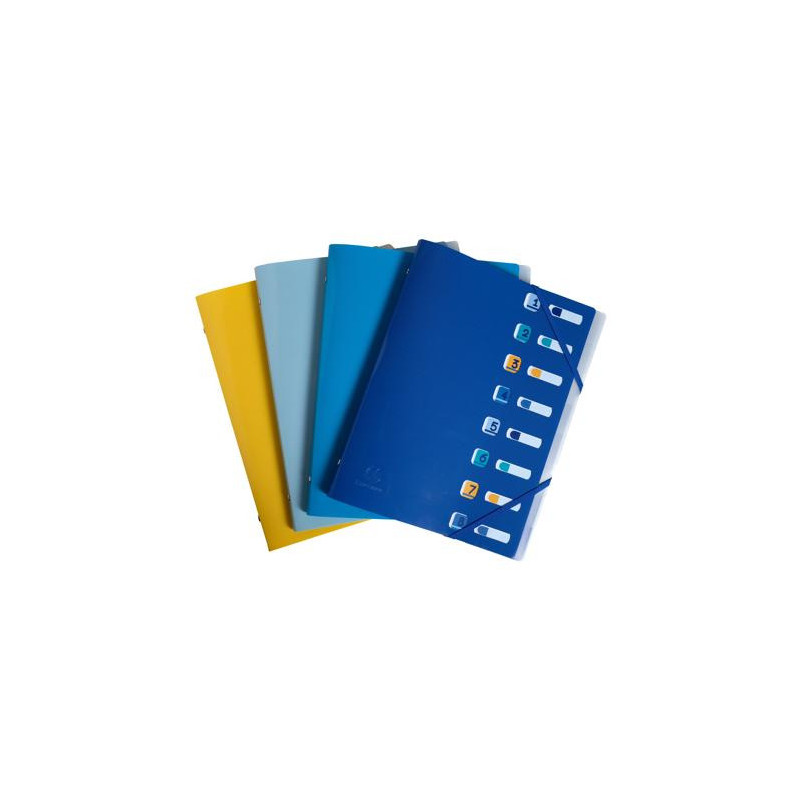 En polypropylène recyclé 5/10ème. 3 rabats intérieurs, fermeture par élastiques. 8 compartiments. Index coloré. Format a4. Coloris assortis : safran, turquoise, bleu marine ou bleu clair. Produit certifié ange bleu.